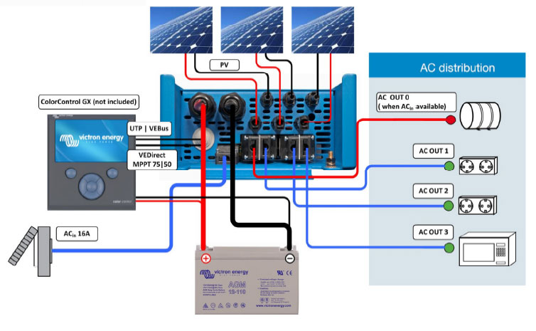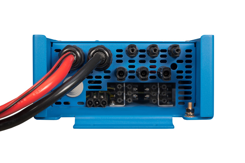 Der MPPT-Lade-Regler und der MultiPlus Wechselrichter-/Ladegerät nutzen dieselben Batteriekabel (mitgeliefert). Die Batterien lassen sich mit Solarstrom (via SmartSolar MPPT) und/oder mit Wechselstrom (Wechselrichter-/Ladegerät) aus dem Stromnetz oder von einem Aggregat laden.