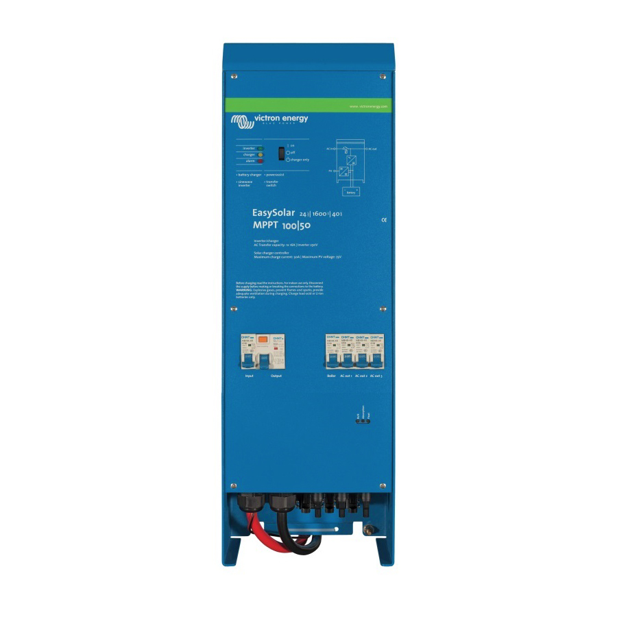 Das EasySolar vereint einen 50A MPPT Solar-Laderegler, einen 1,6 kVA Wechselrichter, einen 40A Batterielader sowie einen 16A Transferschalter und eine kleine Wechseltromverteilung in einem robusten Stahlgehäuse. Die Installation des Kombi-Wechselrichters ist einfach und es ist nur wenig Verkabelung nötig. Für 24V Batterie-Spannung!