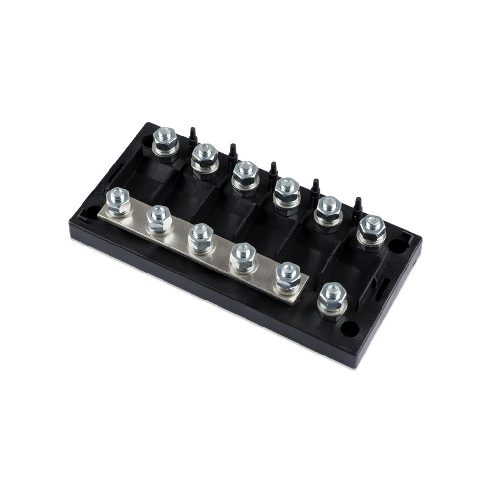 Dieses Sicherungshalter ist für die Montage von bis zu sechs Victron MEGA-Sicherungen geeignet und wird komplett mit Gehäuse, transparenter Abdeckung und Busbar für eine Strombelastung von maximal 250A (max. 70V DC) geliefert. Die Anschlussterminals sind dabei mittels M8 Schraubbolzen passend für die MEGA-Sicherungen des Herstellers ausgeführt.
