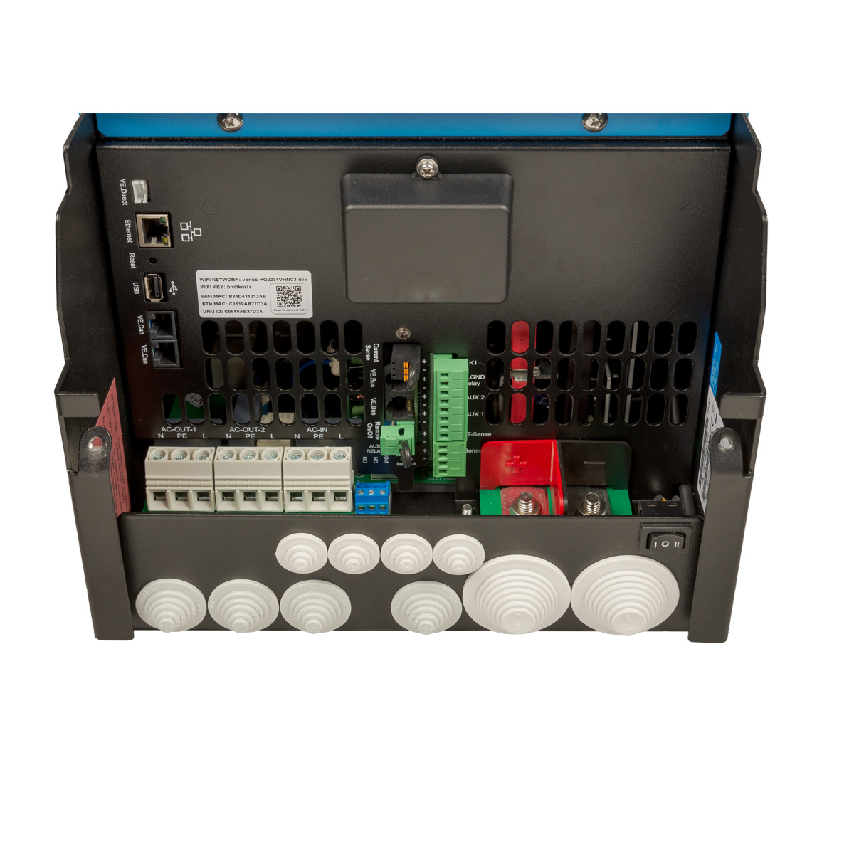 Der EasySolar II 24/3000/70 vereint einen 70A MPPT Solar-Laderegler, einen 3 kVA Wechselrichter, ein 70A Batterie-Ladegerät sowie einen 32A Transferschalter in einem robusten Stahlgehäuse. Ein Display zum einfachen Ablesen der aktuellen Leistungsparameter ist ebenfalls bereits vorne im Gehäuse integriert. Die Installation des Gerätes ist einfach und es ist nur wenig Verkabelung nötig.