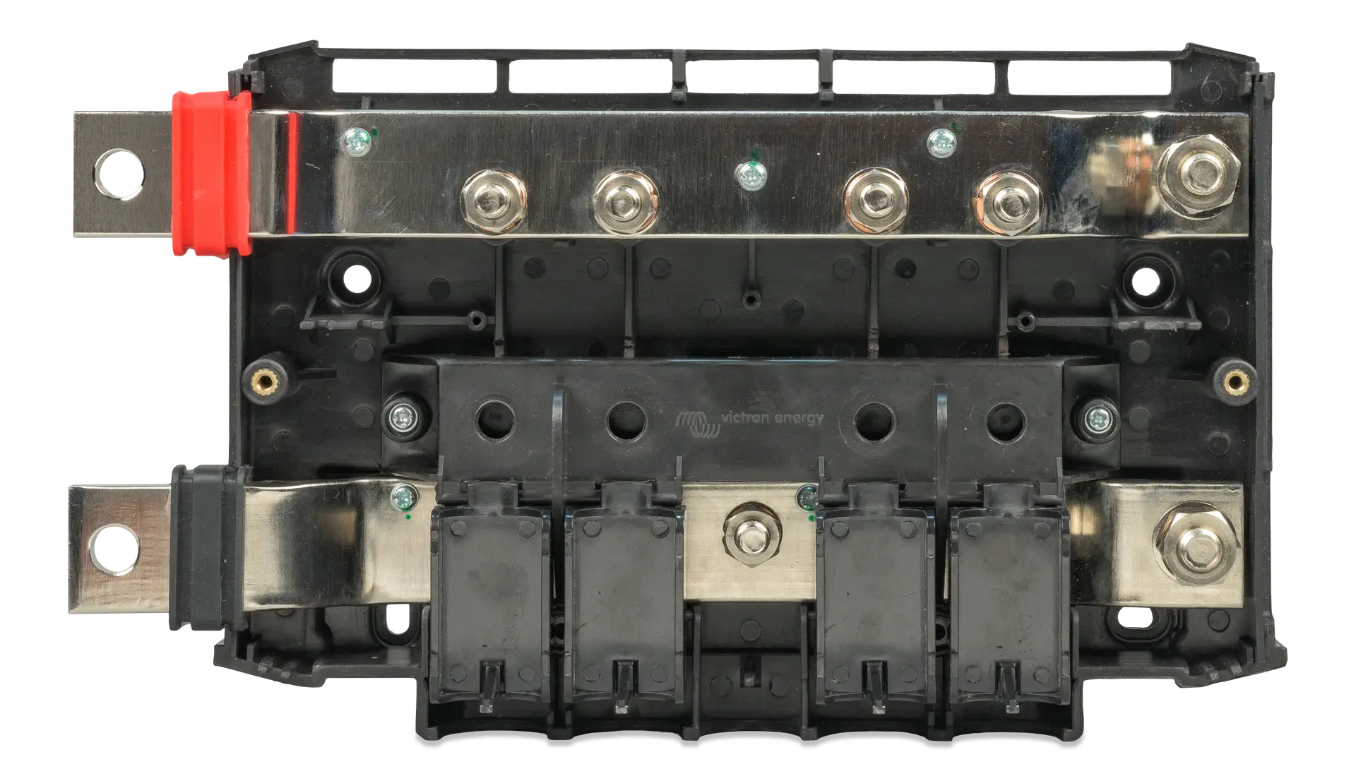 Der Lynx Power In enthält eine Plus- und Minus-Sammelschiene mit jeweils 4 Anschlussbolzen (M8) für Batterien, Lasten oder Ladegeräte sowie einen Masseanschluss. Die Lynx Power In Sammelschiene bildet einen Teil des Lynx-DC-Verteilersystems. Der Lynx Power In kann zum Beispiel auch als einfache modulare DC-Sammelschiene verwendet werden, um bis zu vier Batterien parallel miteinander zu verbinden.