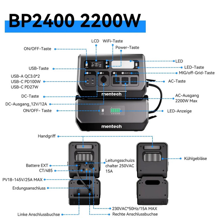 Produktinformationen "Mentech BP2400 Powerstation für Balkonkraftwerk mit 0% MwSt. gemäß § 12 Abs. 3 UStG "
