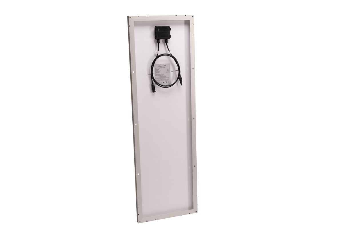 Hocheffizientes 12V Insel-Solarmodul mit rückseitig kontaktierten monokristallinen Solarzellen (SPR) und 110Wp Leistung. Die die rückseitige Kontaktierung der Zellen (SPR) verleiht der Moduloberfläche ein ästhetisch ansprechendes Design. Dieses Modul zeichnet sich durch eine besonders schmals Bauform aus.