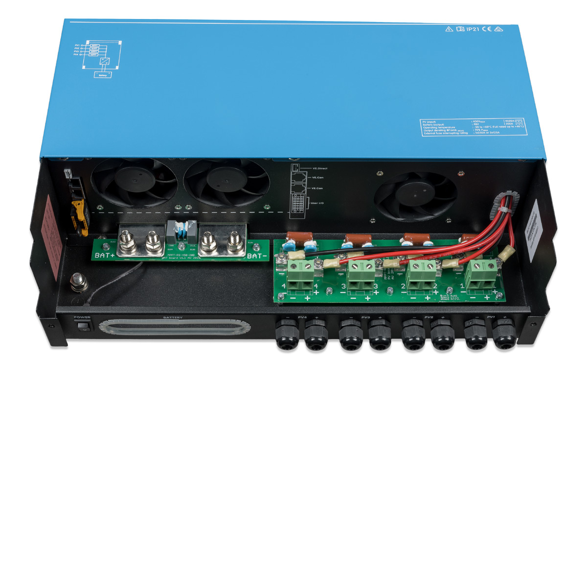 Weitere Merkmale: vollständige Konnektivität (VE.Direct, VE.CAN und Bluetooth), galvanisch isolierte PV-Anschlüsse, integrierter Bildschirm, voll programmierbare Batterieladeparameter und aktive Kühlung. Das neue Design des Metallgehäuses und die vollständig abgedeckten elektrischen Anschlüsse verbessern die Sicherheit.