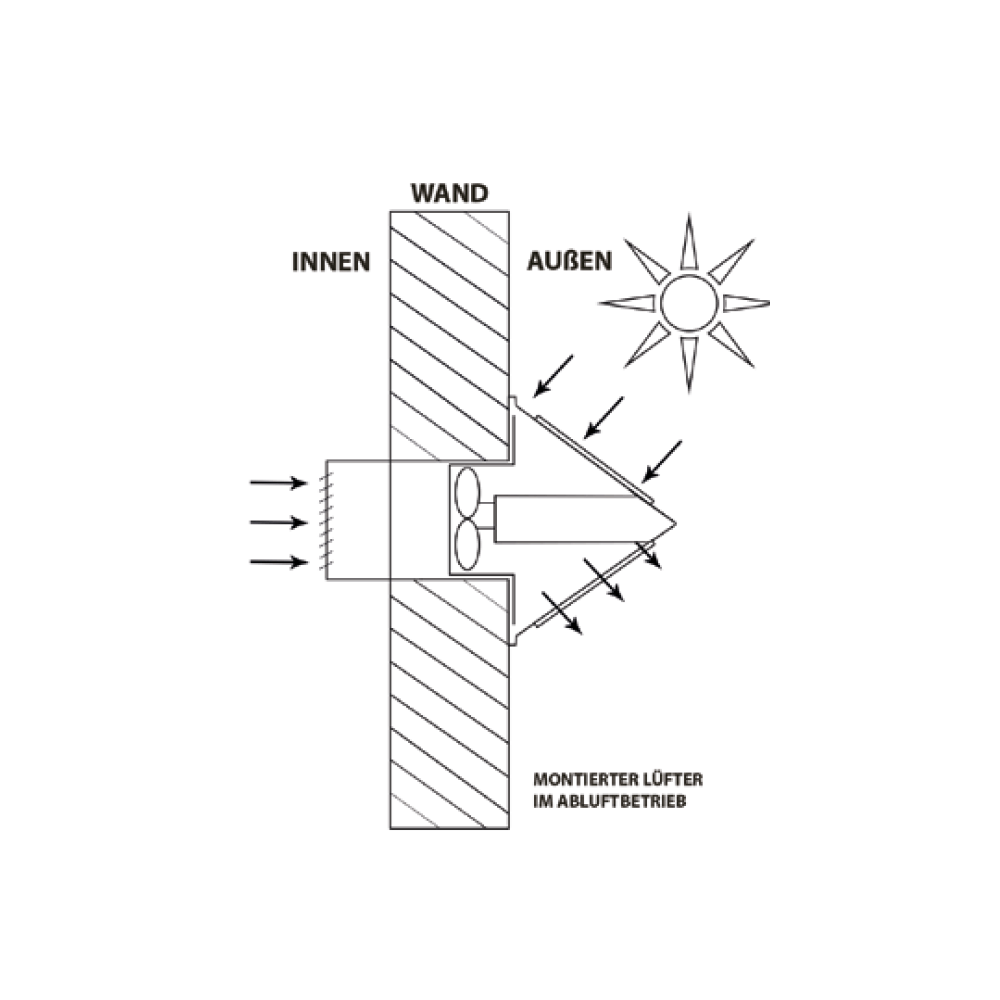 Der Lüfter ist selbstlaufend, sobald die Sonneneinstrahlung stark genug ist (auch bei diffuser Einstrahlung), braucht keinen Stromanschluss oder Verkabelung und kann einfach in eine unbeschattete Außenwand eingebaut werden.
