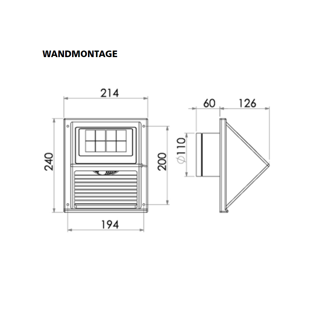 Durch den Tausch der Lüfterräder kann der Solarlüfter je nach Bedarf für Zuluft oder Abluft umgerüstet werden. Wandseitig ist ein 110mm (DN110) Rohranschluss mit 60mm Länge vorgesehen.