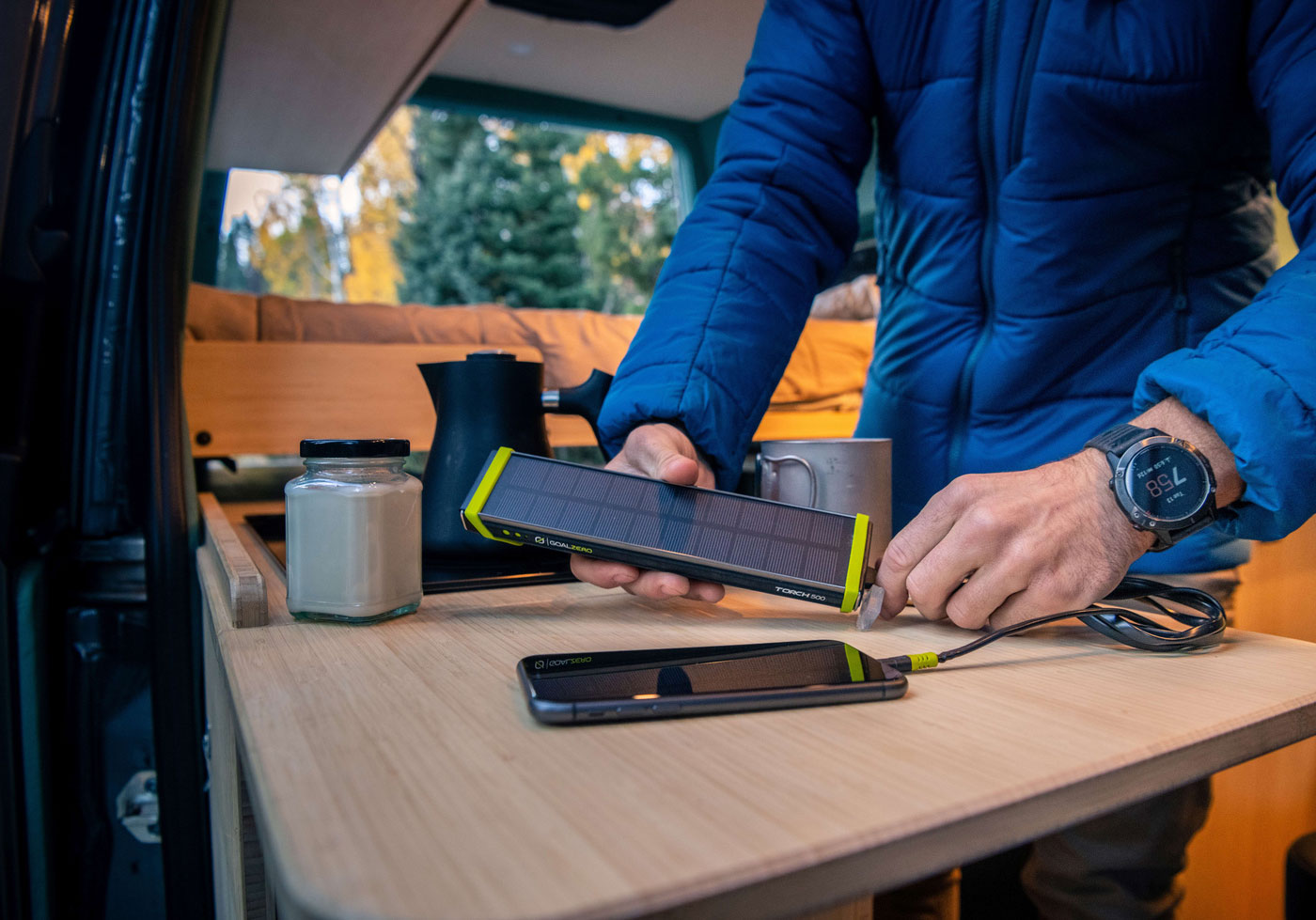 Das eingebaute Solarpanel und der USB-C-Eingang ermöglichen das Aufladen mittels Sonnenenergie und das Laden an einem beliebigen USB-Anschluss.