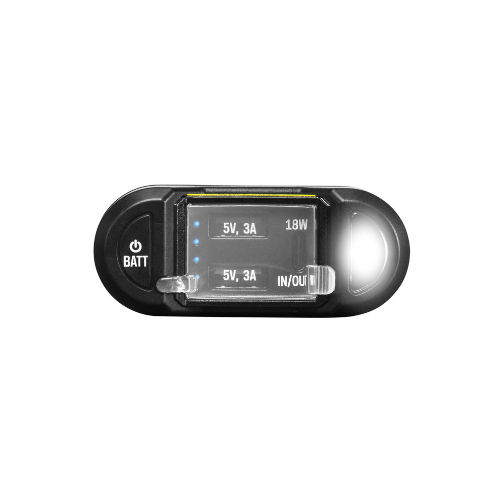 Dual-USB Universal-Akku mit 35Wh Kapazität. Mit Batteriezustands-Anzeige und integrierter LED-Lampe. Spritzwassergeschütztes Gehäuse. Zwei High-Speed USB-Ausgänge mit bis zu 3A Ladestrom und ein USB-C PD Port mit bis zu 18W Ladeleistung - auch für Tablets geeignet.