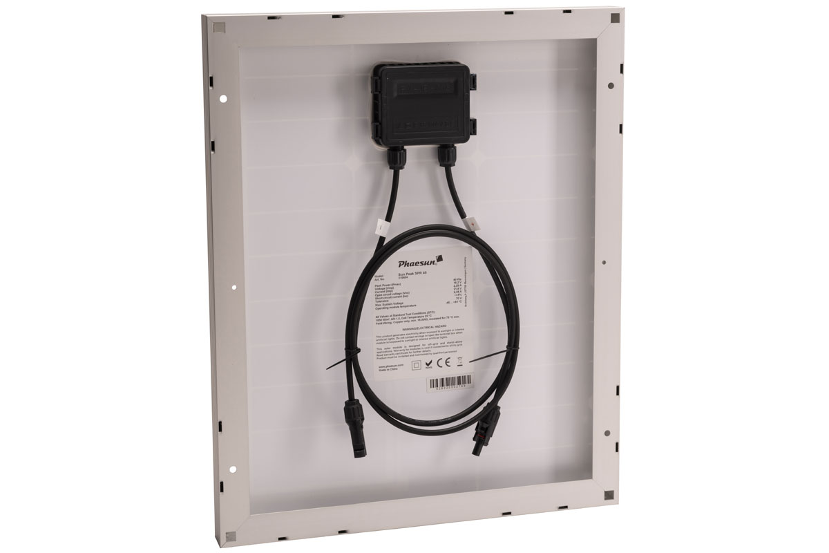 Hocheffizientes 12V Insel-Solarmodul mit rückseitig kontaktierten monokristallinen Solarzellen (SPR) und 40Wp Leistung. Die die rückseitige Kontaktierung der Zellen (SPR) verleiht der Moduloberfläche ein ästhetisch ansprechendes Design.